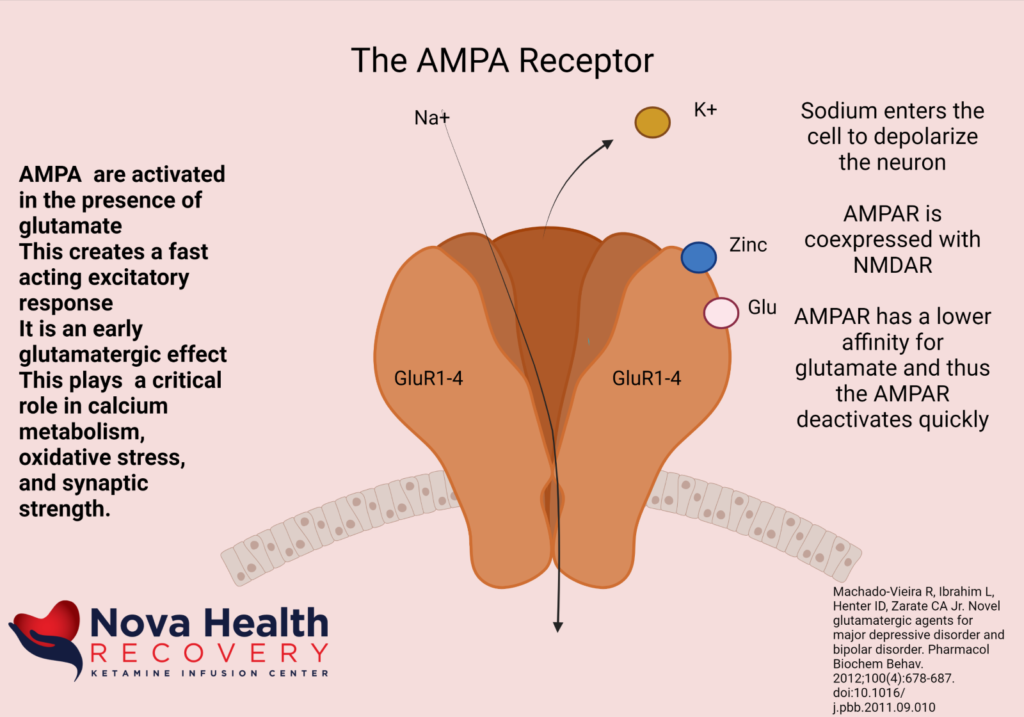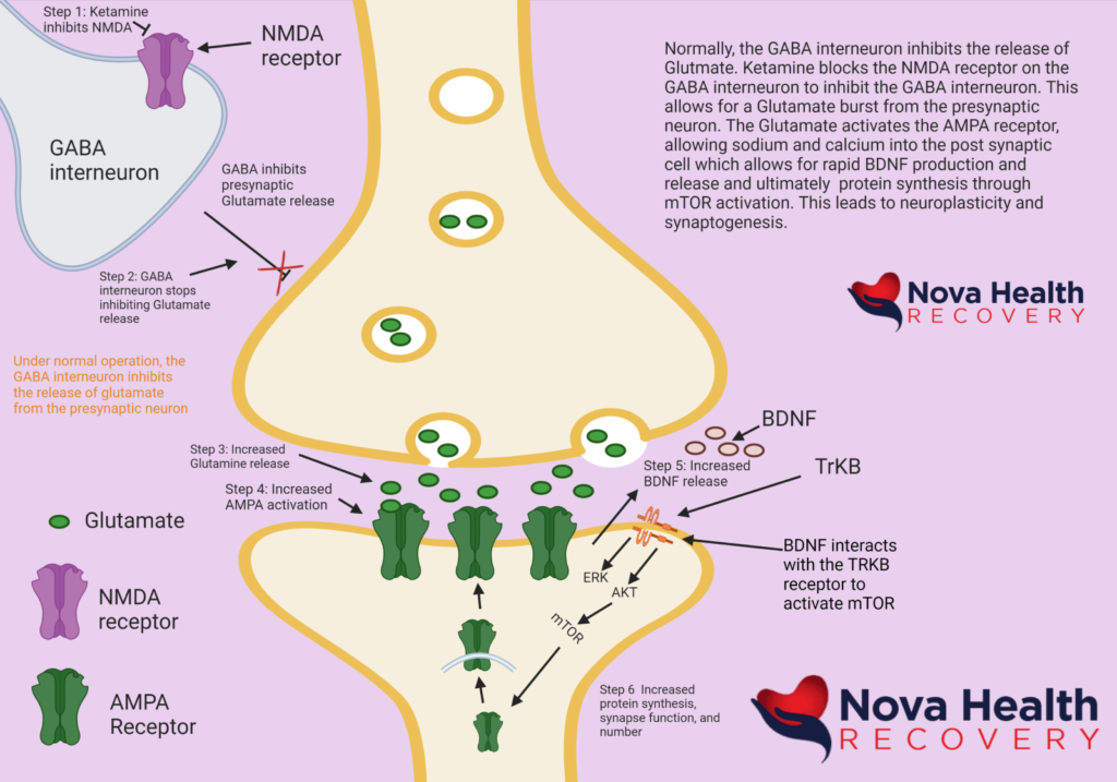 The rapid increase of glutamate in the synapse initially activates AMPA receptors, which results in a calcium influx that depolarizes the neuron. There is a resulting cascade of metabolism that results in the stimulation and formation of brain derived neurotrophic factor (BDNF) and the mTOR pathways. This results in increased synapse formation, increased synaptic strength, and alterations in neurotransmitter control, especially of serotonin and dopamine. The promotion of synaptic growth can “reset” the stress that has caused structural changes in depression. This allows for improved emotional processing as well as improved functioning of memory areas the prefrontal cortex ( executive functioning) and the hippocampus (short-term memory).