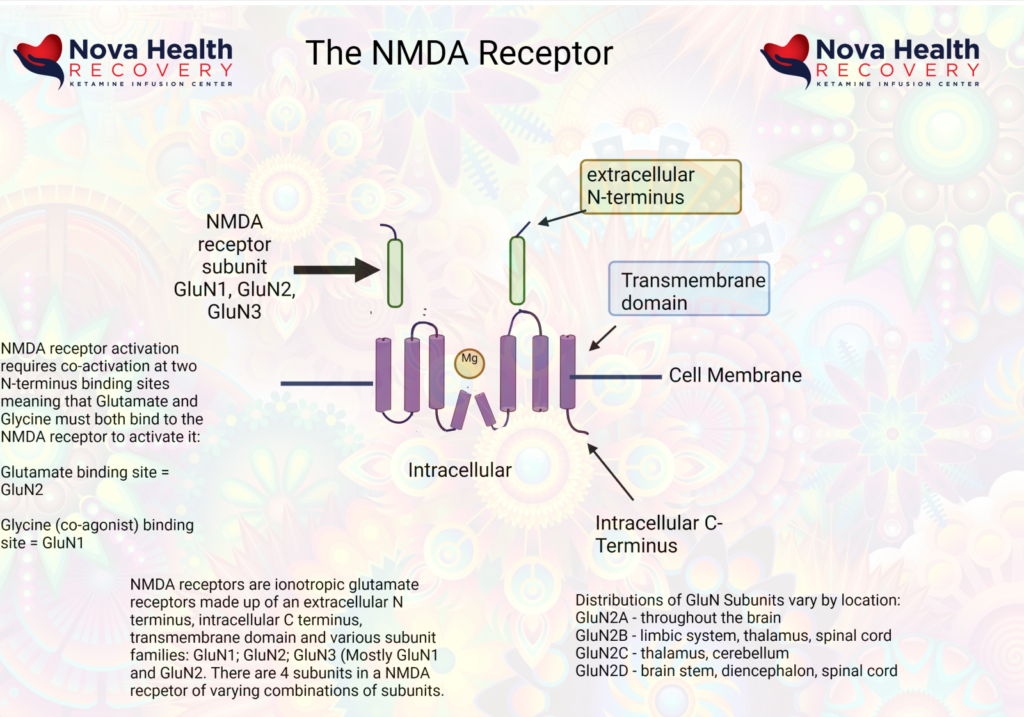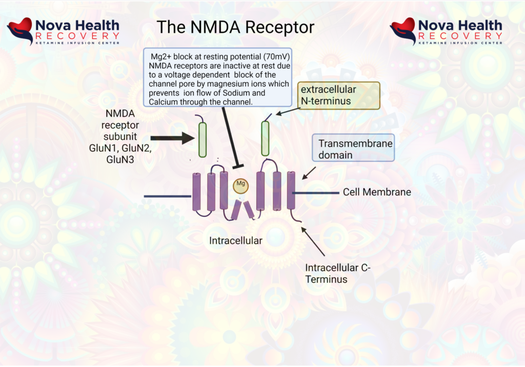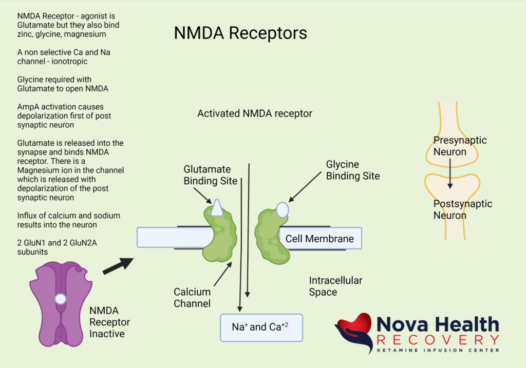 Ketamine binds the numerous receptors, but its main effect is through its activity as a non-competitive NMDA receptor antagonist, where it blocks the PCP binding site of the NMDA receptor and prevents depolarization of the neuron. Generally speaking, the NMDA receptor is an excitatory receptor playing a role in learning and sensory perception. Ketamine also interacts with other receptors at higher doses, such as the opioid receptors, which may contribute to the anti-pain (antinociceptive) effects of ketamine. (7)(8) Ketamine also interacts with the HCN1 and sigma receptors as an antagonist. It is also an antagonist at muscarinic CNS receptors and agonistic (activating) at alpha- and beta-adrenergic receptors.