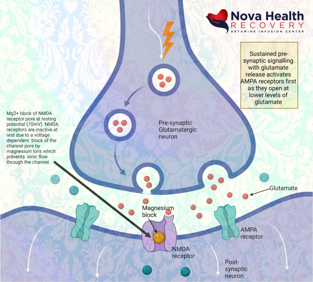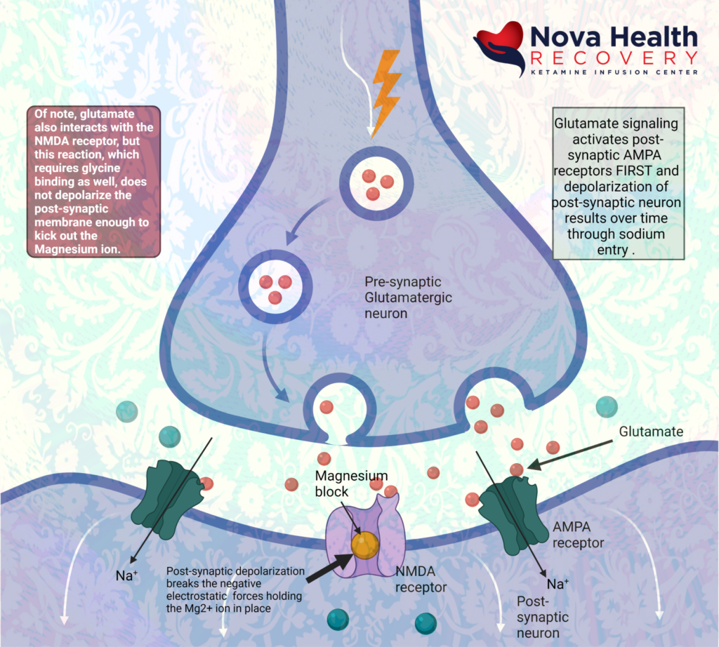 So, the AMPA receptor gets activated first with glutamate binding and allows a current of sodium ions into the post synaptic neuron, which then depolarizes the neuron and pushes out the Magnesium ion in the NMDA channel. The NMDA receptor now can allow sodium and calcium ions into the post-synaptic neuron to cause downstream protein production (BDNF and synaptogenesis).