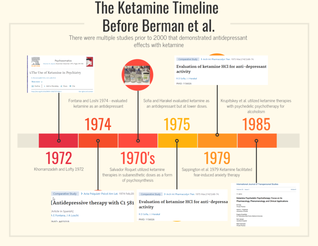 Although ketamine was discovered in 1962 and FDA approved for anesthesia in 1970, ketamine was quickly recognized as having the potential to augment psychotherapy. the earliest studies were in 1972 in Iran as listed above in the timeline. It wasn’t until the year 2000 when Berman et al. did a small study of ketamine in treatment resistant cases that demonstrated rapid and robust efficacy of ketamine therapy.