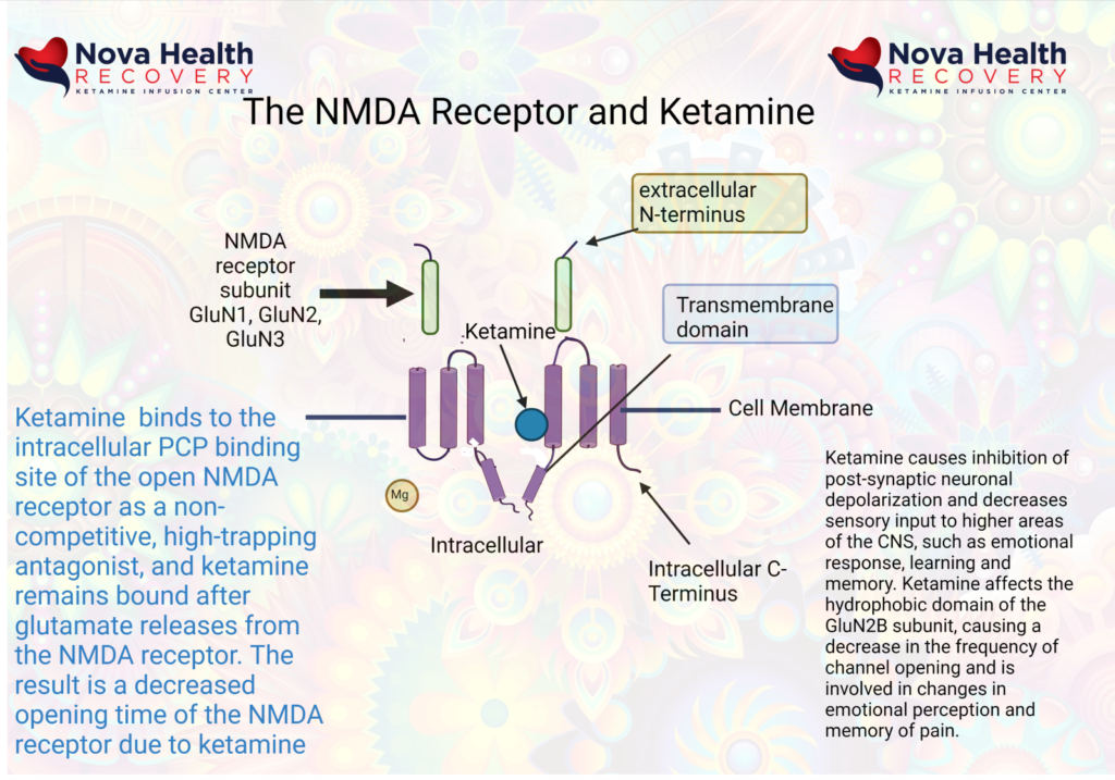 Ketamine acts at the internal pore PCP site in the intracellular portion of the pore, where it’s binding on primarily the Glu2N unit results in decreased opening time of the pore and less calcium inflow. This decreases sensory input to higher areas of the CNS, such as emotional response, learning and memory.